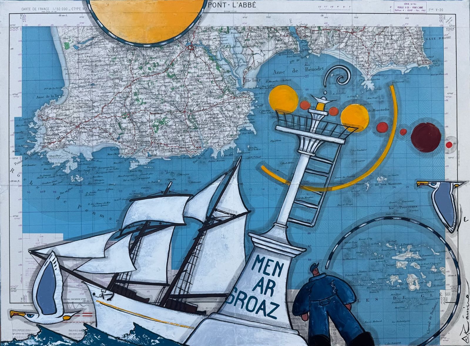 Acrylique sur carte géographique ancienne, contre-collée sur lin et montée sur châssis bois.