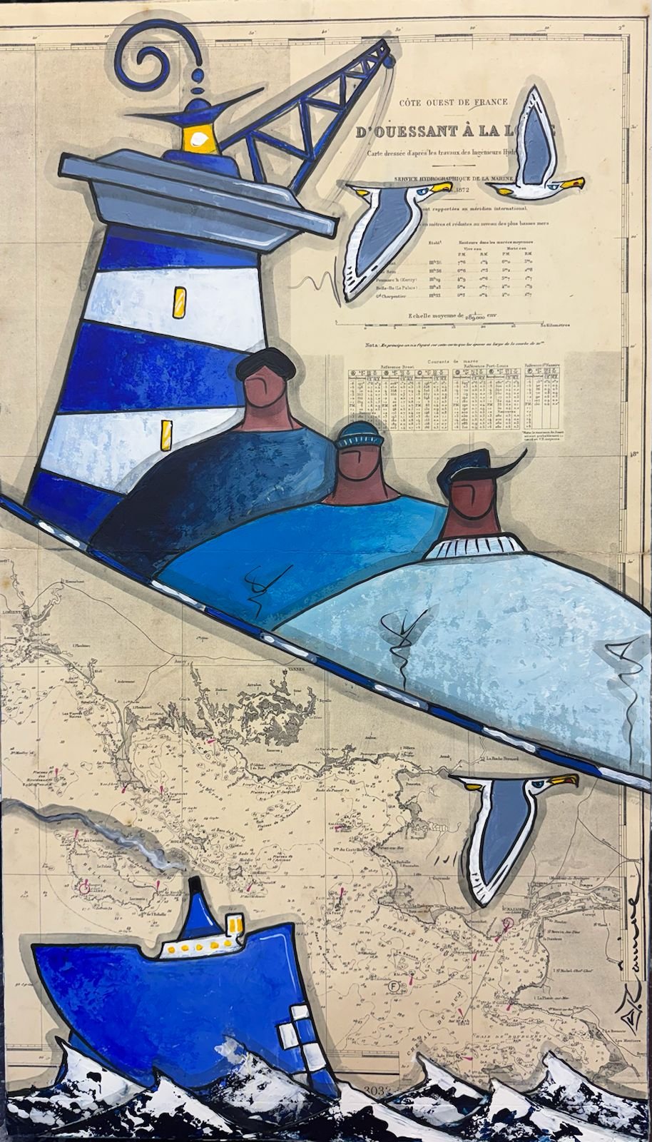 Technique : acrylique sur carte marine ancienne contre-collée sur bois.