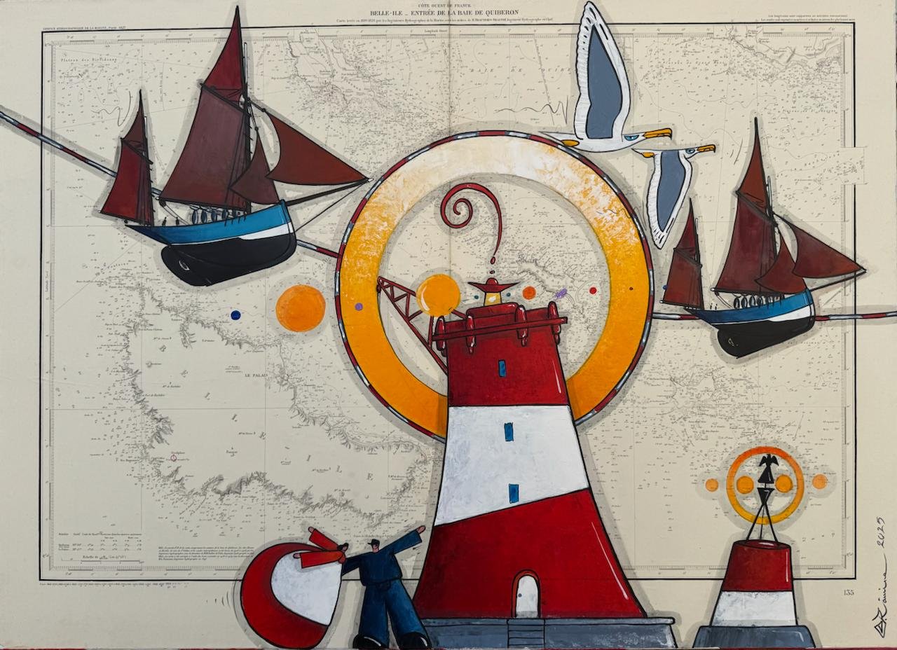 Techniques : acrylique sur carte marine ancienne contre-collée sur lin et montée sur châssis bois.