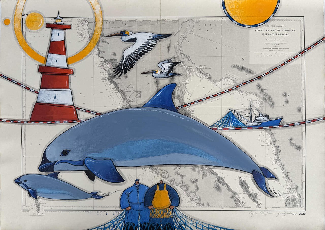 Technique: Acrylic on an original and old marin chart laminated on cavas non frame mounted .