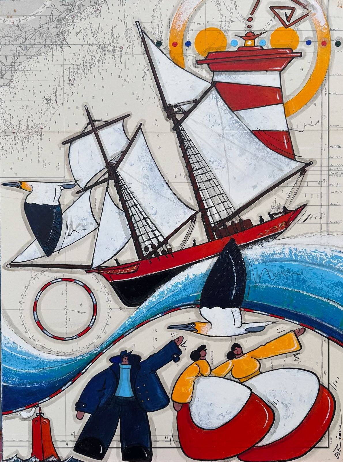 Technique : acrylique sur carte marine ancienne contre-collée sur lin et montée sur châssis.